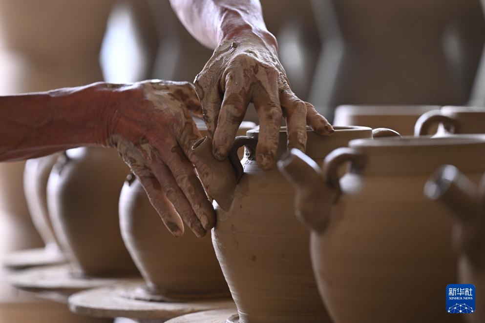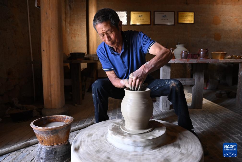 7月18日,在周宁县浦源镇萌源村月山古龙窑制作间,肖家涨在制作传统硋器。新华社记者 姜克红 摄