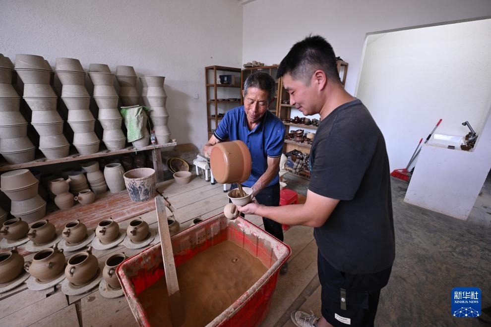 7月18日,在周宁县浦源镇萌源村月山古龙窑制作间,肖家涨(左)与儿子肖永灿在为坯体上釉。新华社记者 姜克红 摄