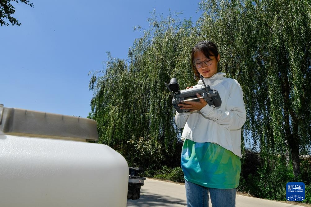 7月21日,在位于吉林省四平市梨树县的“科技小院”试验田,中国农业大学学生黄怡调整植保无人机参数。新华社记者 张楠 摄