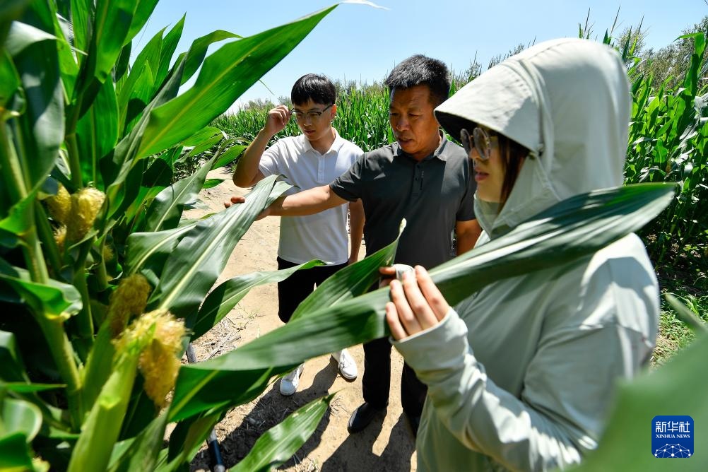 7月21日,在位于吉林省四平市梨树县的“科技小院”试验田,鑫源农机农民专业合作社理事长赵刚(中)向大学生们介绍玉米生长情况。新华社记者 张楠 摄