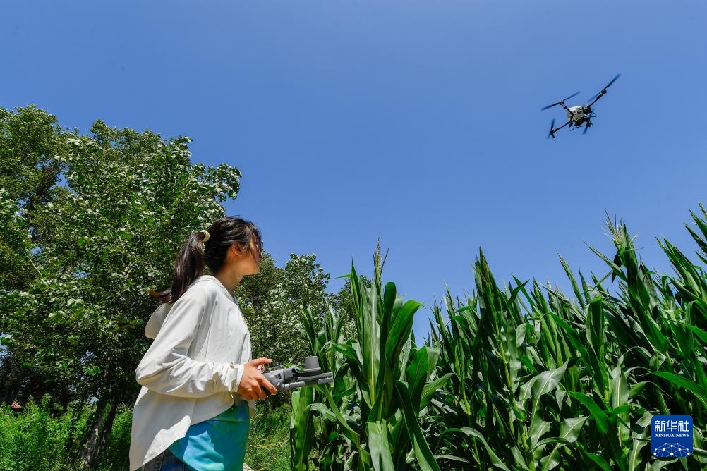 7月21日,在位于吉林省四平市梨树县的“科技小院”试验田,中国农业大学学生黄怡操控植保无人机为玉米精准施肥。新华社记者 张楠 摄