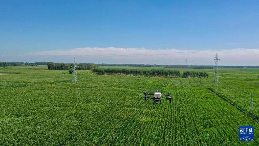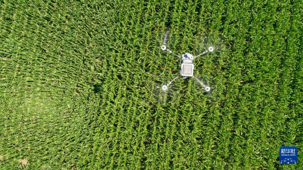 7月21日,在位于吉林省四平市梨树县的“科技小院”试验田,植保无人机为玉米精准施肥(无人机拍摄)。新华社记者 张楠 摄