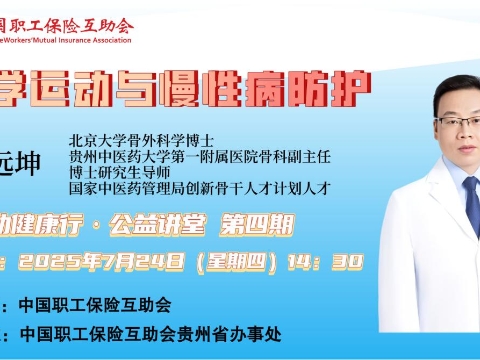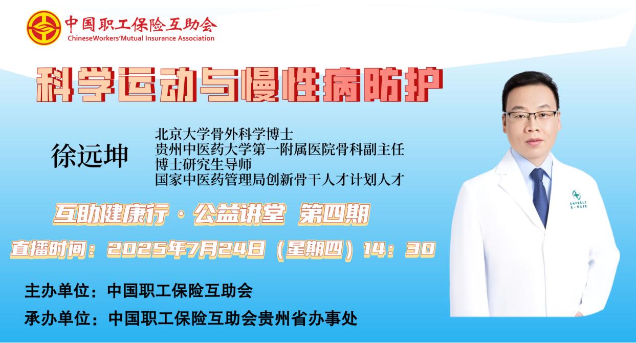 直播回顾|“互助健康行·公益讲堂”2025年第四期——科学运动与慢性病防护 2025年7月24日(周四)下午14:30至16:00,由中国职工保险互助会主办、中互会贵州省办事处承办的2025年第四期“互助健康行•公益讲堂”——《科学运动与慢性病防护》,开启线上直播。本期“互助健康行·公益讲堂”线上直播活动邀请贵州中医药大学第一附属医院骨科副主任,教授 、博士研究生导师,国家中医药管理局创新骨干人才计划人才,贵州中医药大学第一附属医院中医骨伤科后备学科带头人,世界中医药联合会骨伤分会常委,贵州省医学会骨科学第十三届委员会委员,世界数字骨科学会中华数字骨科学会贵州分会第一届委员徐远坤教授,和职工会员们聊一聊科学运动和慢性病防护之间的关系,如何通过科学运动有效降低慢性病发病风险,显著提高生活质量。中工网首页、微博、抖音号同步播出。