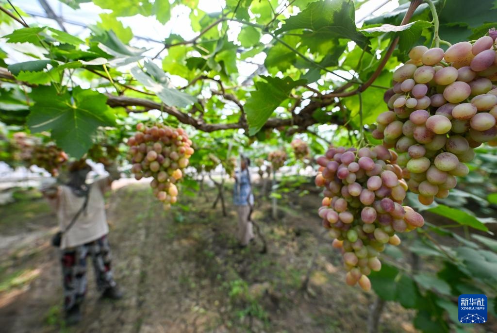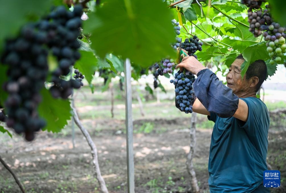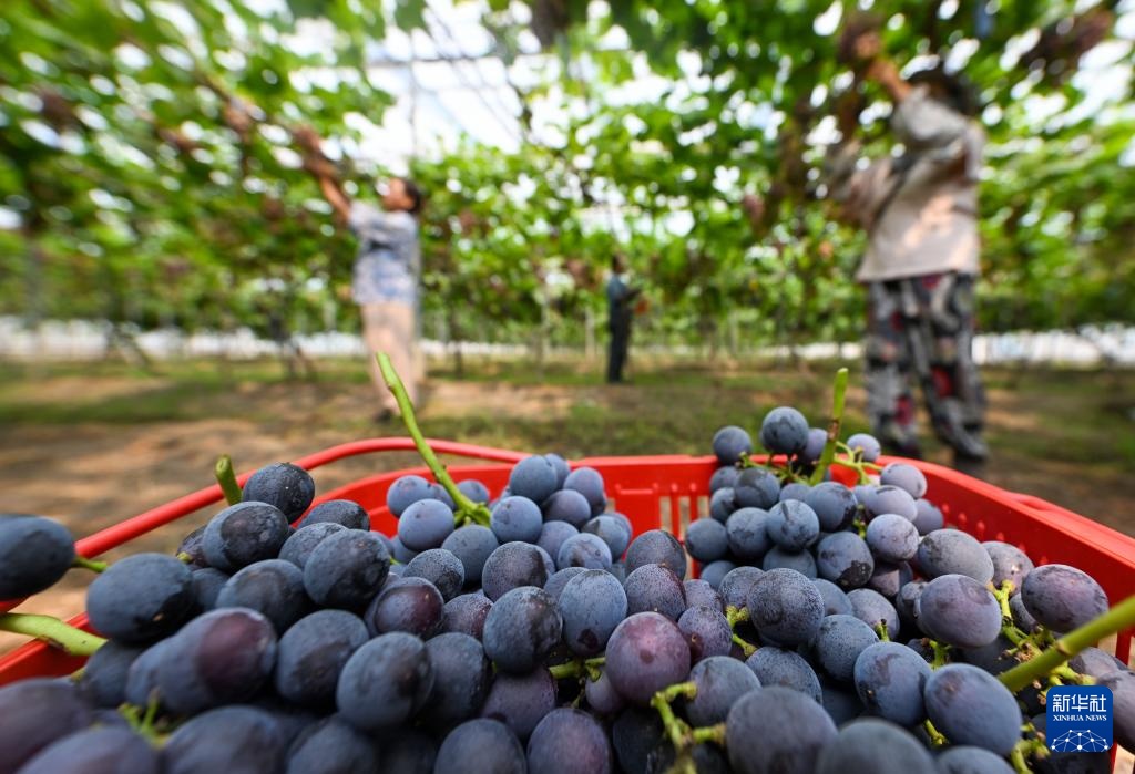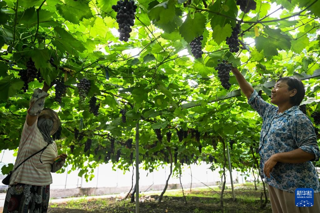 7月24日,在天津市滨海新区茶淀葡萄科技园,果农在采摘葡萄。新华社记者 赵子硕 摄