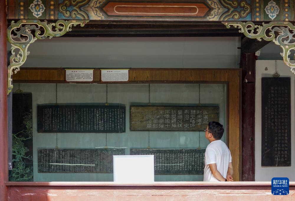 7月24日,游客在重庆云阳张飞庙内观赏古代文化名人的书法作品。新华社记者 刘潺 摄
