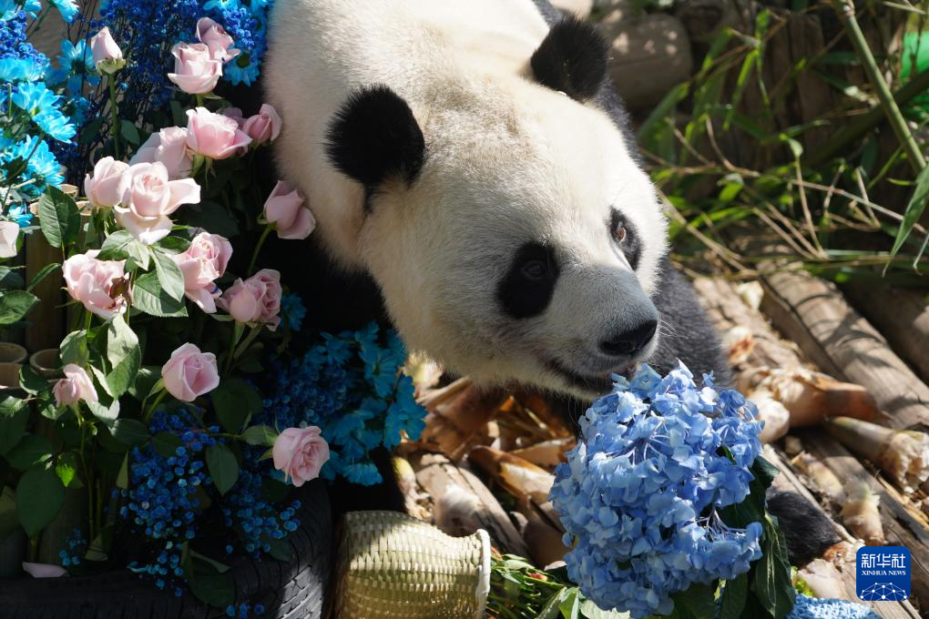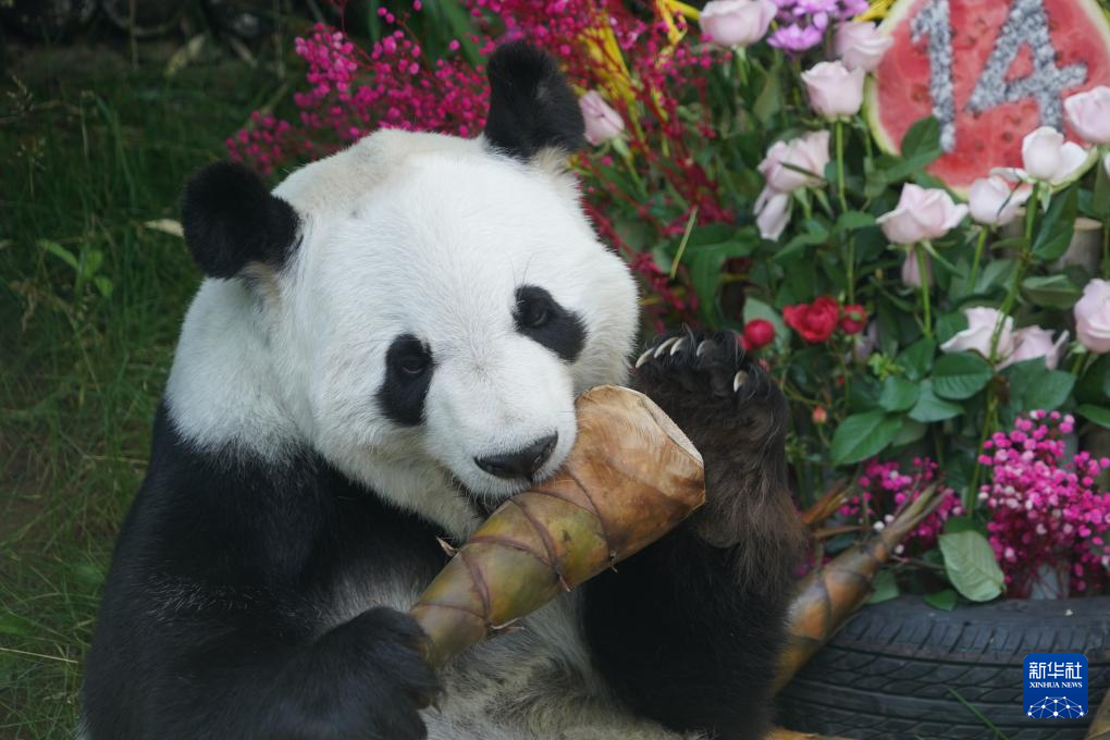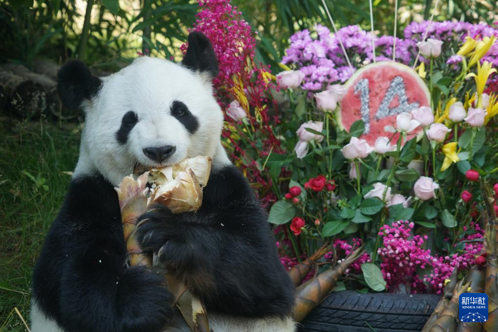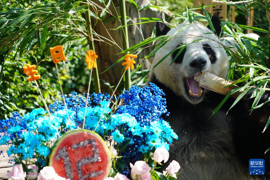 7月26日,在青海省西宁市,大熊猫“双欣”“和兴”在西宁熊猫馆迎来生日会。雄性大熊猫“和兴”今年12岁,雌性大熊猫“双欣”今年14岁,工作人员为它们准备了苹果、西瓜和竹笋等“生日大餐”,还布置了鲜花和玩具为它们庆祝生日。