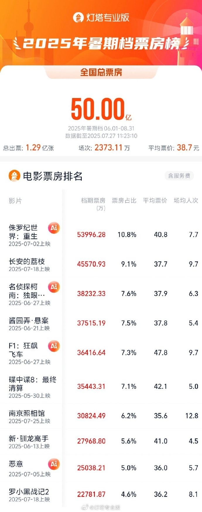 据网络平台数据,截至7月27日11时23分,2025年暑期档(6月—8月)总票房(含预售)突破50亿!《侏罗纪世界:重生》《长安的荔枝》《名侦探柯南:独眼的残像》暂列档期票房前三名。(工人日报客户端记者 姜雨晴)