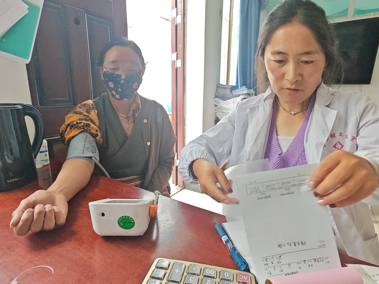 7月20日,在西藏自治区曲松县下洛村卫生室,村医旦增群宗在给一位村民测血压。
