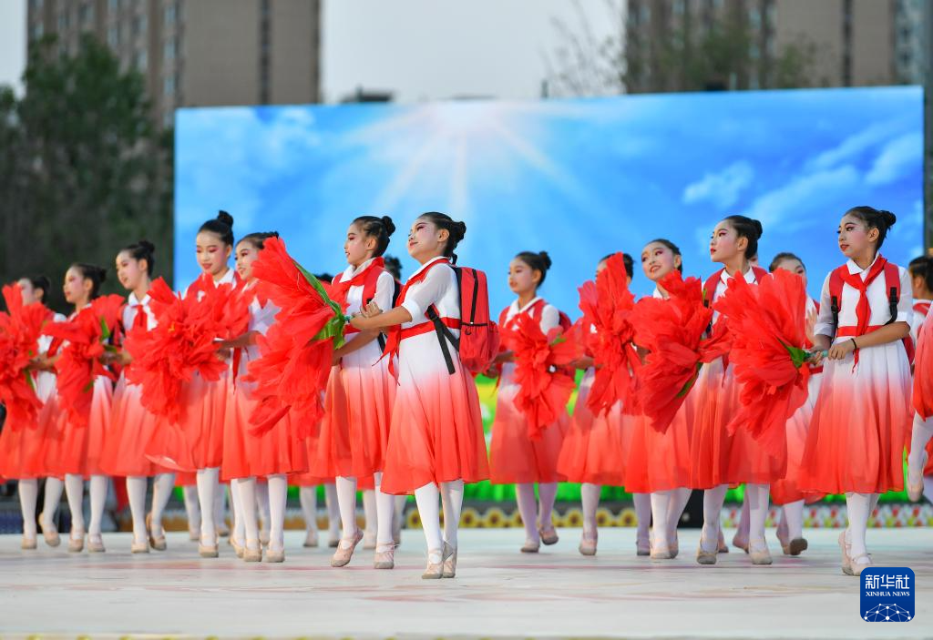 乌鲁木齐市米东区的舞蹈队表演舞蹈《坐着校车去上学》(7月28日摄)。新华社记者 胡虎虎 摄