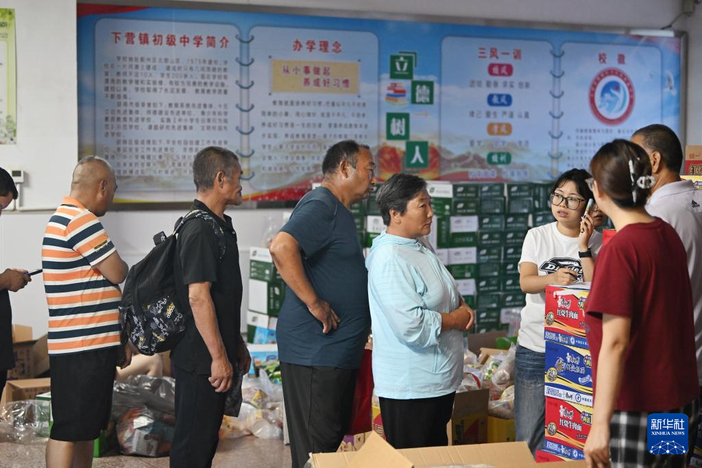 7月28日,集中安置群众在天津市蓟州区下营镇初级中学排队领取物资。新华社记者 李然 摄