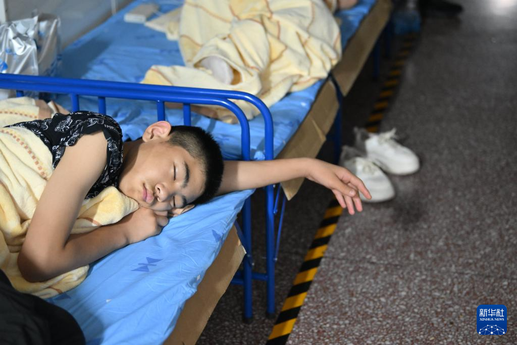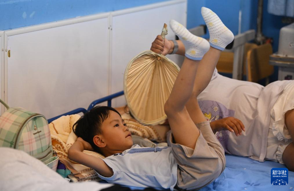7月29日,一名小朋友在天津市蓟州区下营镇初级中学睡觉。新华社记者 李然 摄