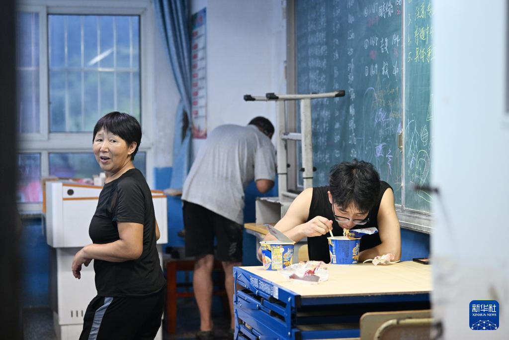 7月28日,集中安置群众在天津市蓟州区下营镇初级中学吃泡面。新华社记者 李然 摄
