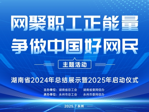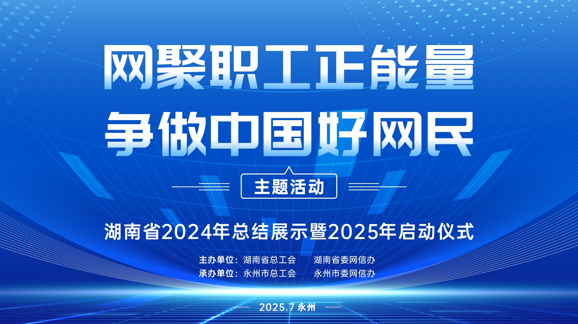 直播回顾|网聚职工正能量 争做中国好网民主题活动湖南省2024年总结展示暨2025年启动仪式 由湖南省总工会、湖南省委网信办联合主办,永州市总工会、永州市委网信办承办的2025年湖南省“网聚职工正能量 争做中国好网民”主题活动于7月31日上午9:30在永州市工人文化宫正式启动,以更加澎湃激昂的正能量,激励广大职工群众脚踏实地、奋发进取、拼搏奉献,为书写中国式现代化壮丽篇章作出更大贡献。