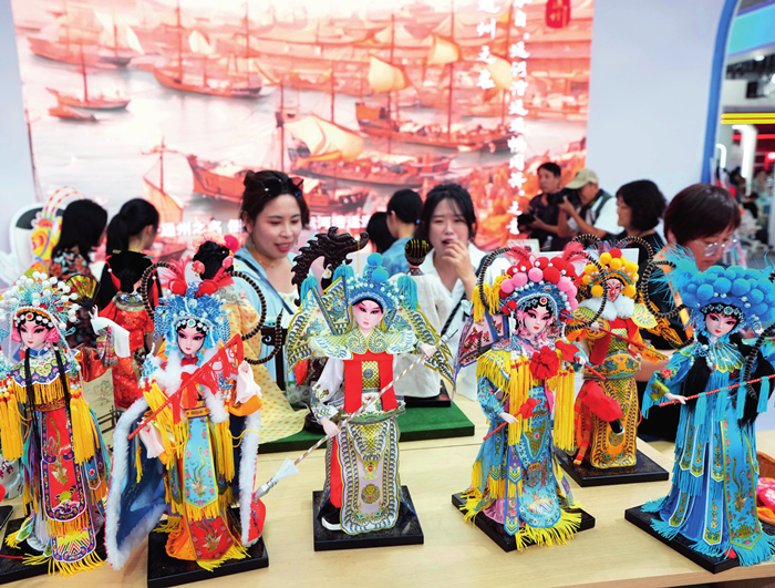 观众观看服贸会文旅服务专题展区通州展台上的戏曲人物造型摆件(2024年9月15日摄)陈晔华摄 / 《瞭望》新闻周刊