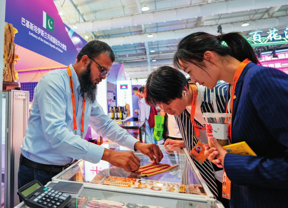 服贸会首钢园区内,参观者在巴基斯坦伊斯兰共和国驻华 大使馆展区选购商品(2024年9月12日摄)鞠焕宗摄/《瞭望》新闻周刊