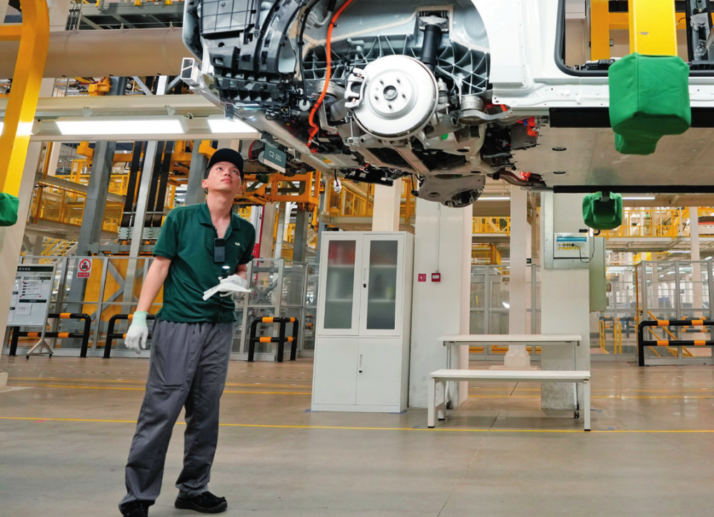 工作人员在理想汽车北京智能制造基地总装车间内工作 (2025年6月18日摄)鞠焕宗摄/《瞭望》新闻周刊