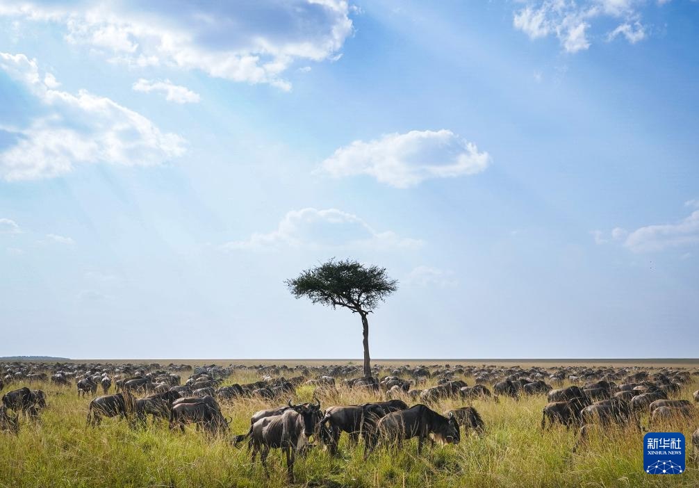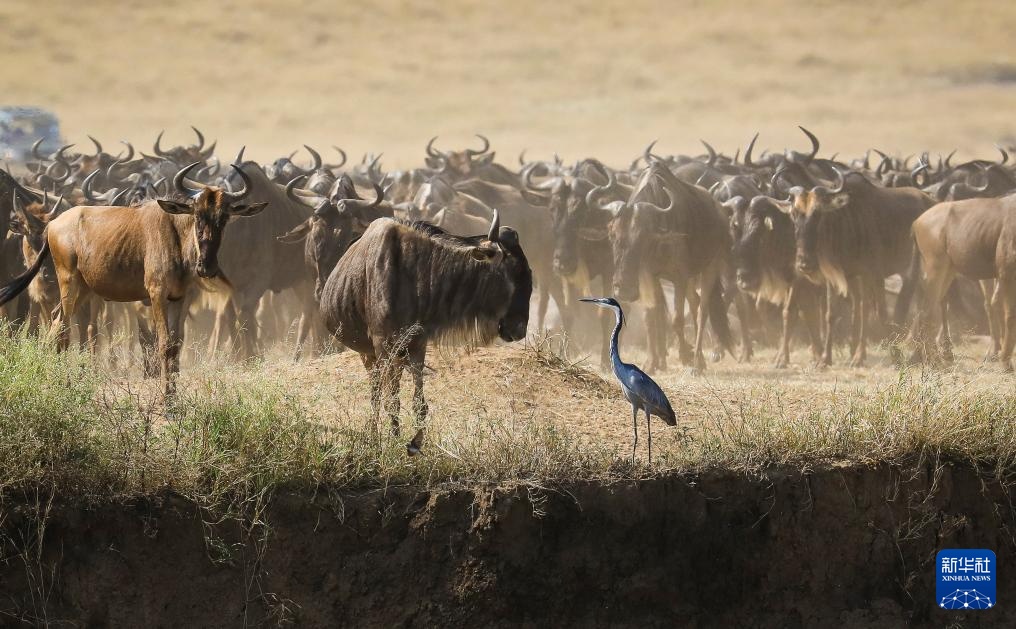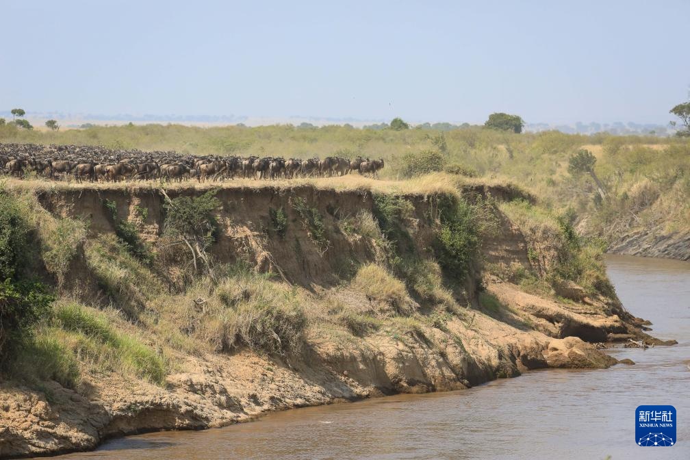 7月30日,在肯尼亚马赛马拉国家保护区,成群的角马聚集在马拉河边准备渡河。新华社记者 韩旭 摄