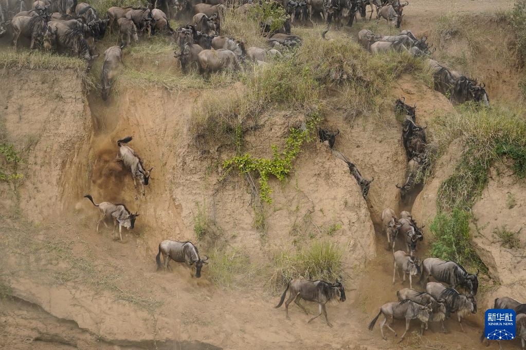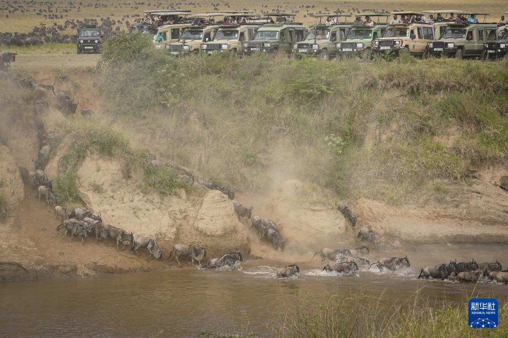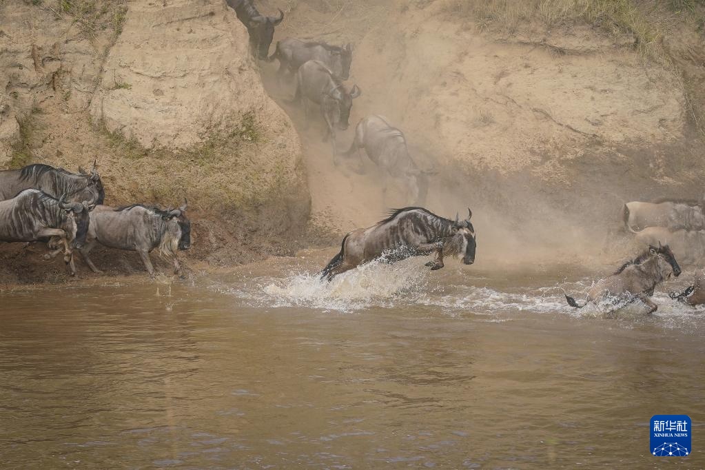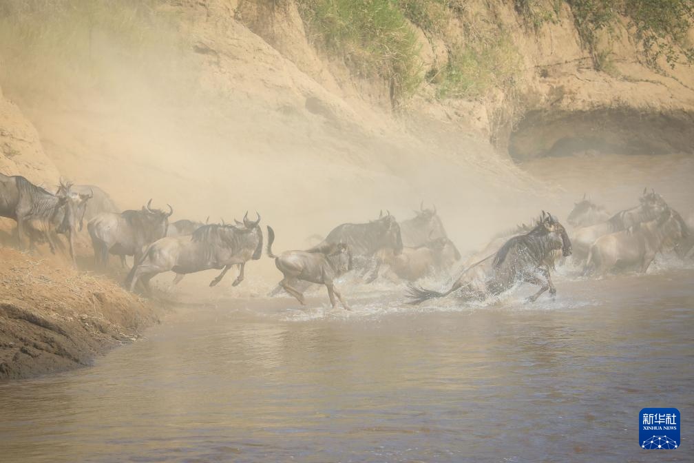 7月30日,在肯尼亚马赛马拉国家保护区,角马渡过马拉河。新华社记者 韩旭 摄