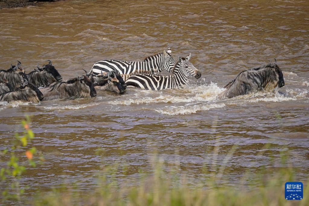 7月30日,在肯尼亚马赛马拉国家保护区,角马和斑马渡过马拉河。新华社记者 韩旭 摄