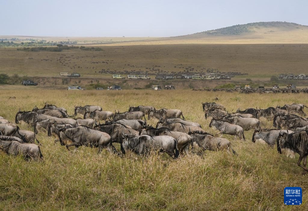 7月30日,在肯尼亚马赛马拉国家保护区,渡过马拉河的角马在草原上活动。新华社记者 韩旭 摄
