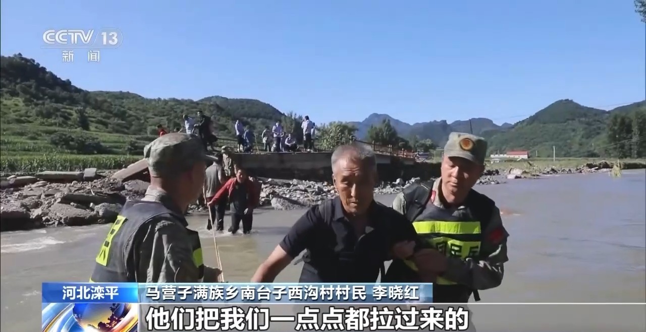 马营子满族乡南台子西沟村村民 李晓红:官兵们拉着绳索,将我们逐一转移过来;对于无法自行通过的群众,解放军同志都将其背了过来。我们深受感动,非常感激他们。