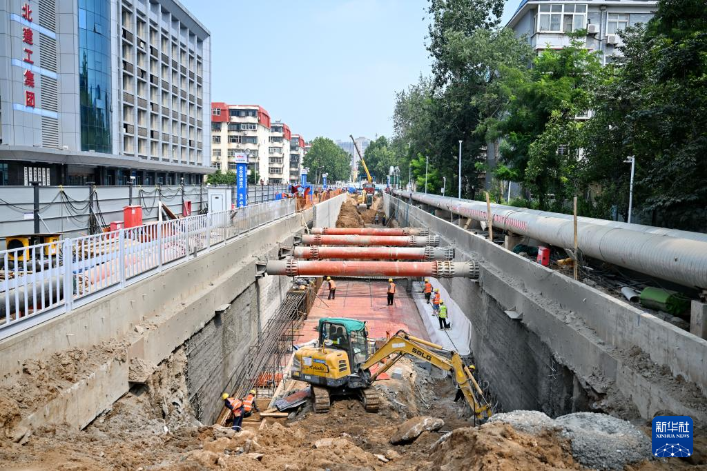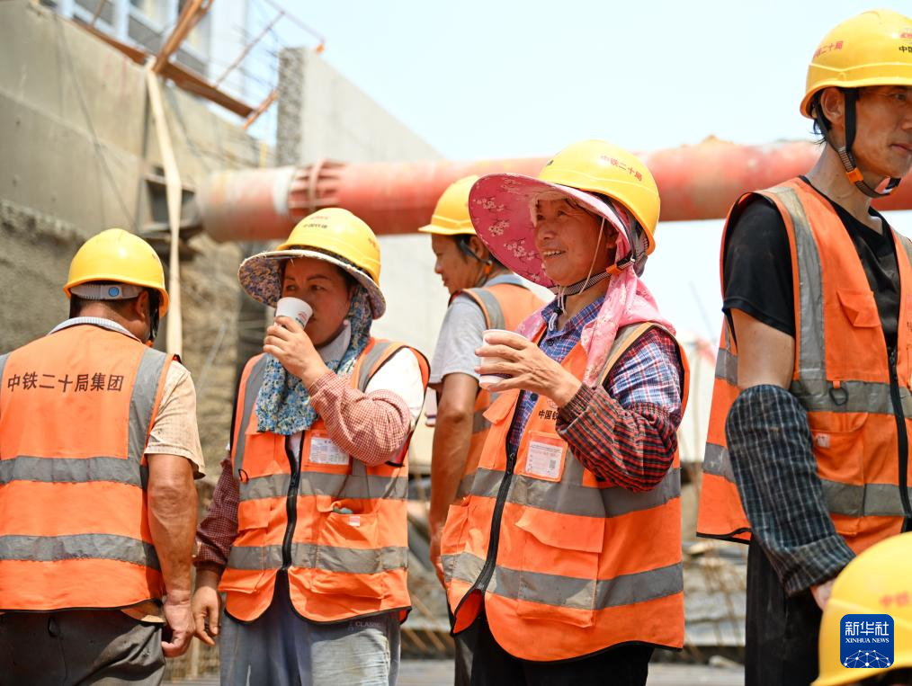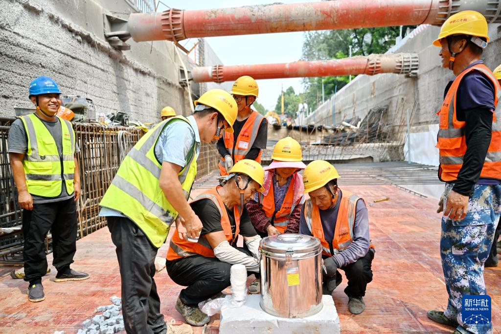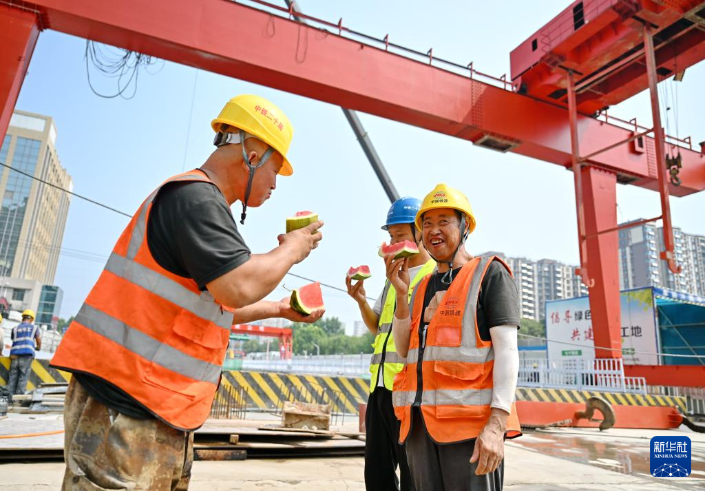 在石家庄市城市轨道交通5号线一期工程建设现场,中铁二十局集团等承建单位通过调整劳动作业时间、加强防暑降温等措施,保障工程建设有序推进。