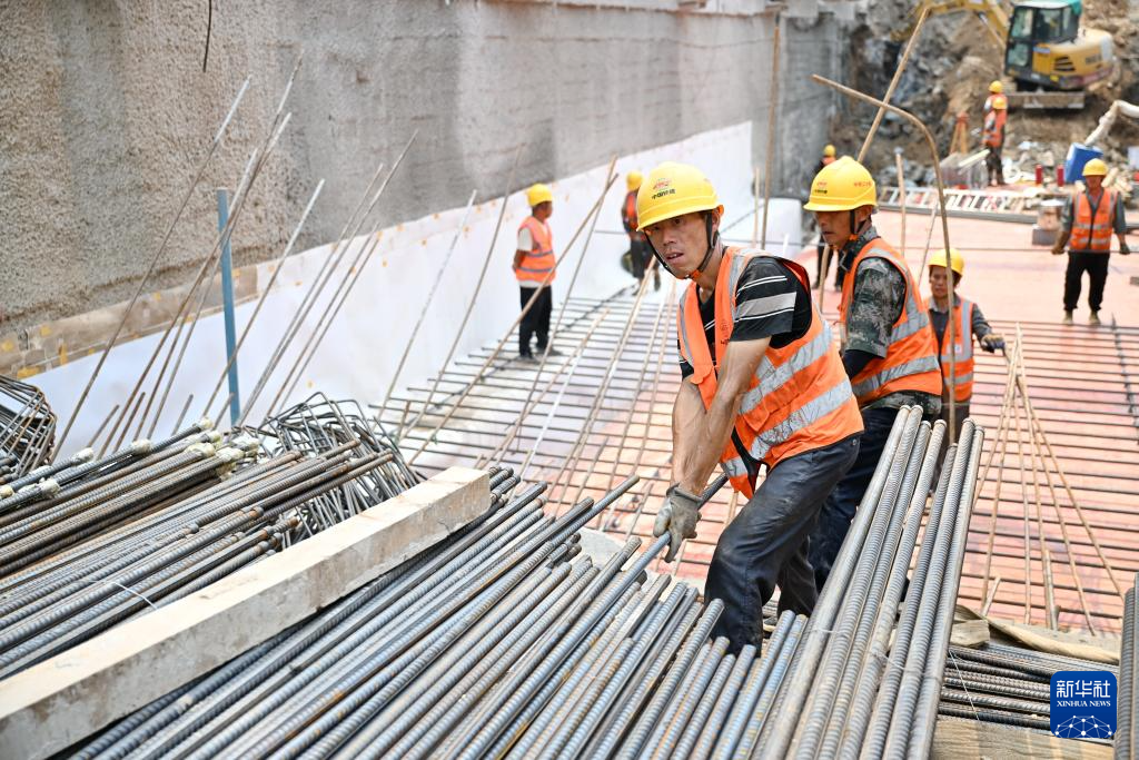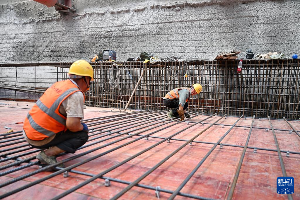 8月3日,中铁二十局工人在石家庄市城市轨道交通5号线一期03工区施工现场铺设钢筋。新华社记者 牟宇 摄