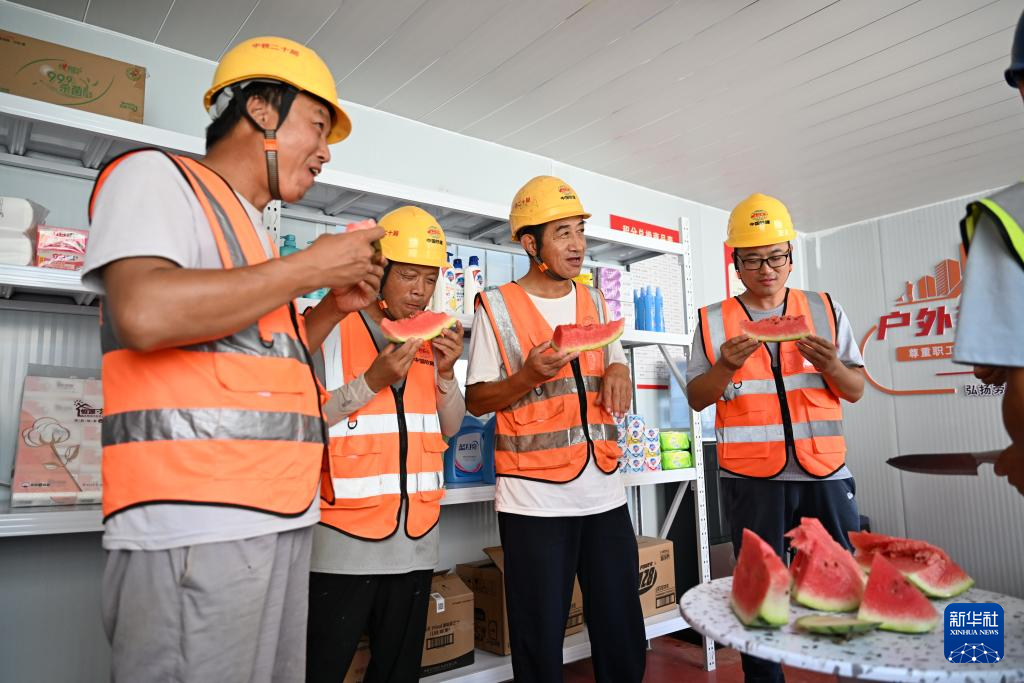8月3日,中铁二十局工人在石家庄市城市轨道交通5号线一期03工区工会驿站内吃西瓜解暑。新华社记者 牟宇 摄