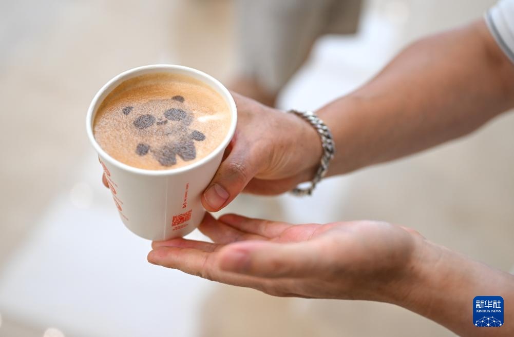 8月4日,一名媒体记者在成都世运会主媒体中心展示由咖啡机器人制作的带有吉祥物“蜀宝”图案的饮品。新华社记者 贝赫 摄