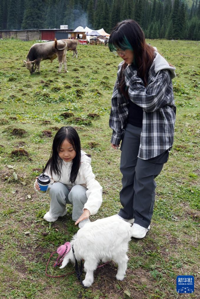 7月30日,在新疆伊犁哈萨克自治州昭苏县夏塔景区,游客与小动物互动。新华社记者 刘莲芬 摄