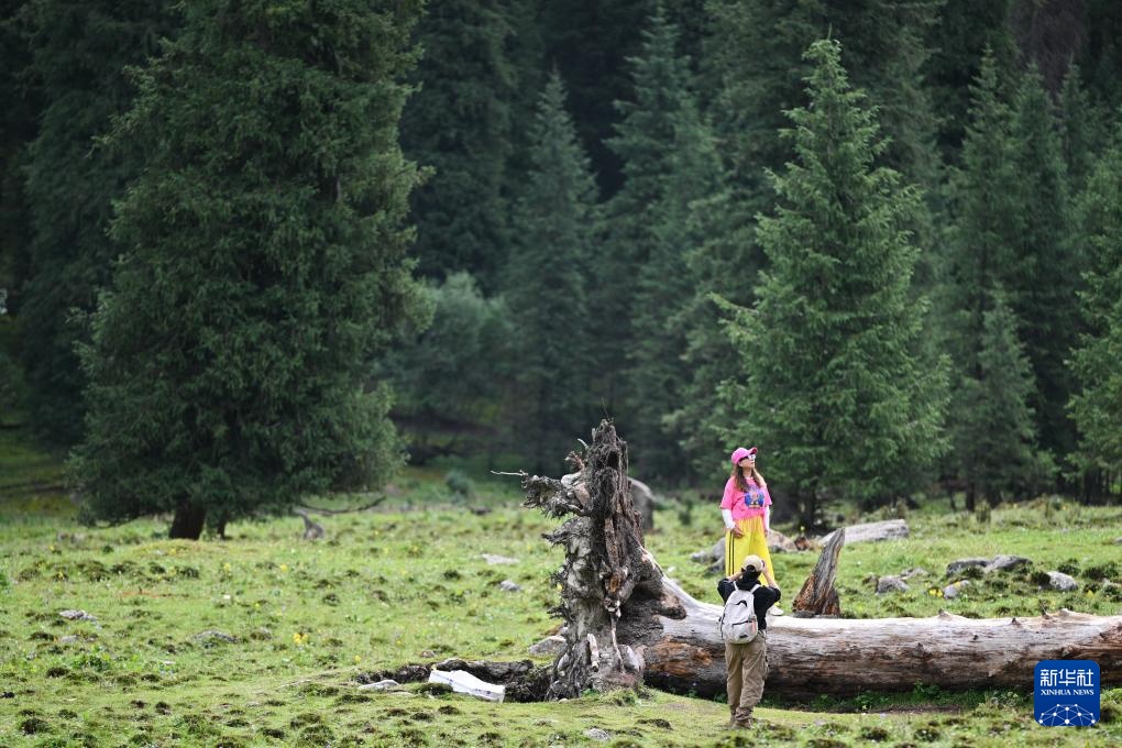 7月30日,游客在新疆伊犁哈萨克自治州昭苏县夏塔景区内留影。新华社记者 辛悦卫 摄
