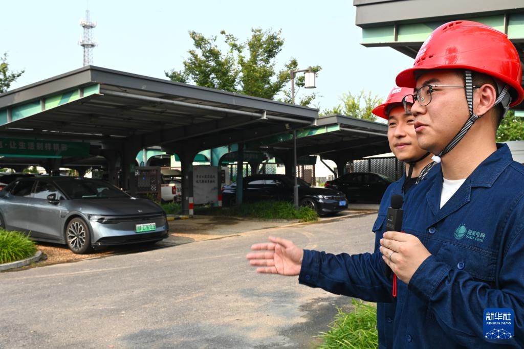8月4日,在浙江省杭州市萧山区梅林村,技术人员介绍光充储一体化充电站。新华社记者 毛竹 摄