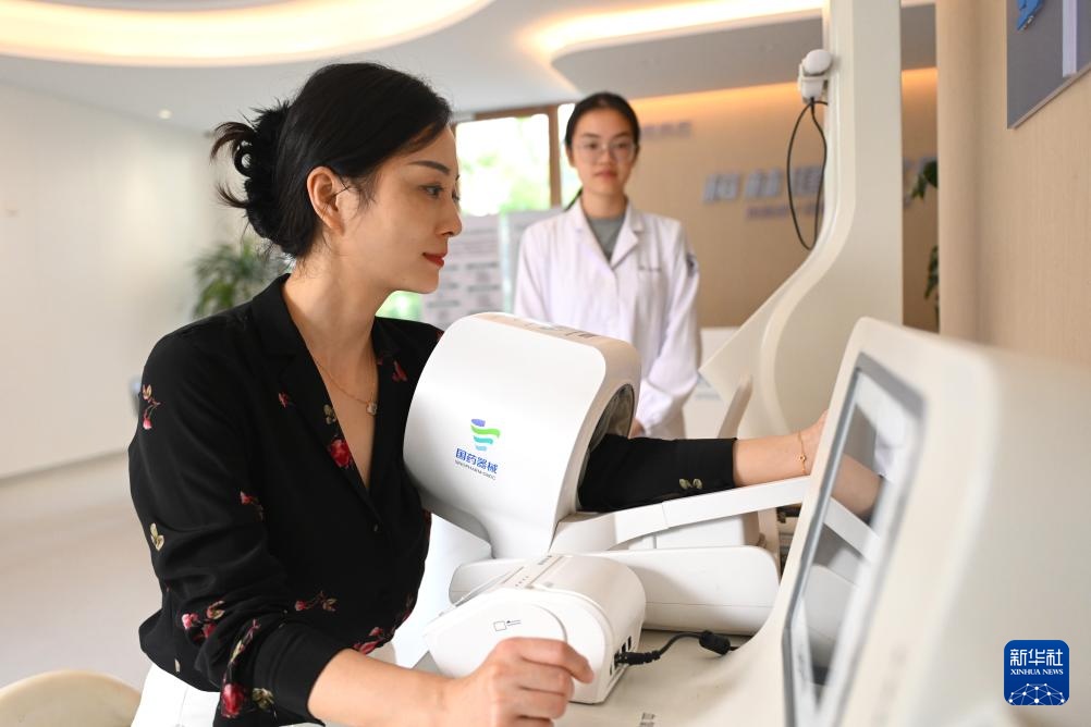 8月4日,一名女士在浙江省杭州市萧山区梅林村的智慧健康小站自助测量血压。新华社记者 毛竹 摄
