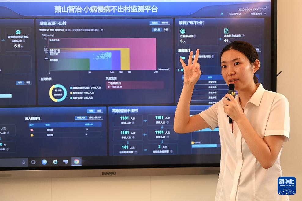 8月4日,在浙江省杭州市萧山区梅林村,工作人员介绍智慧健康监测平台。新华社记者 毛竹 摄