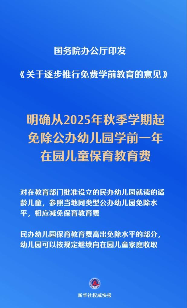 国务院办公厅印发《关于逐步推行免费学前教育的意见》,5日对外公布。意见明确,从2025年秋季学期起,免除公办幼儿园学前一年在园儿童保育教育费。