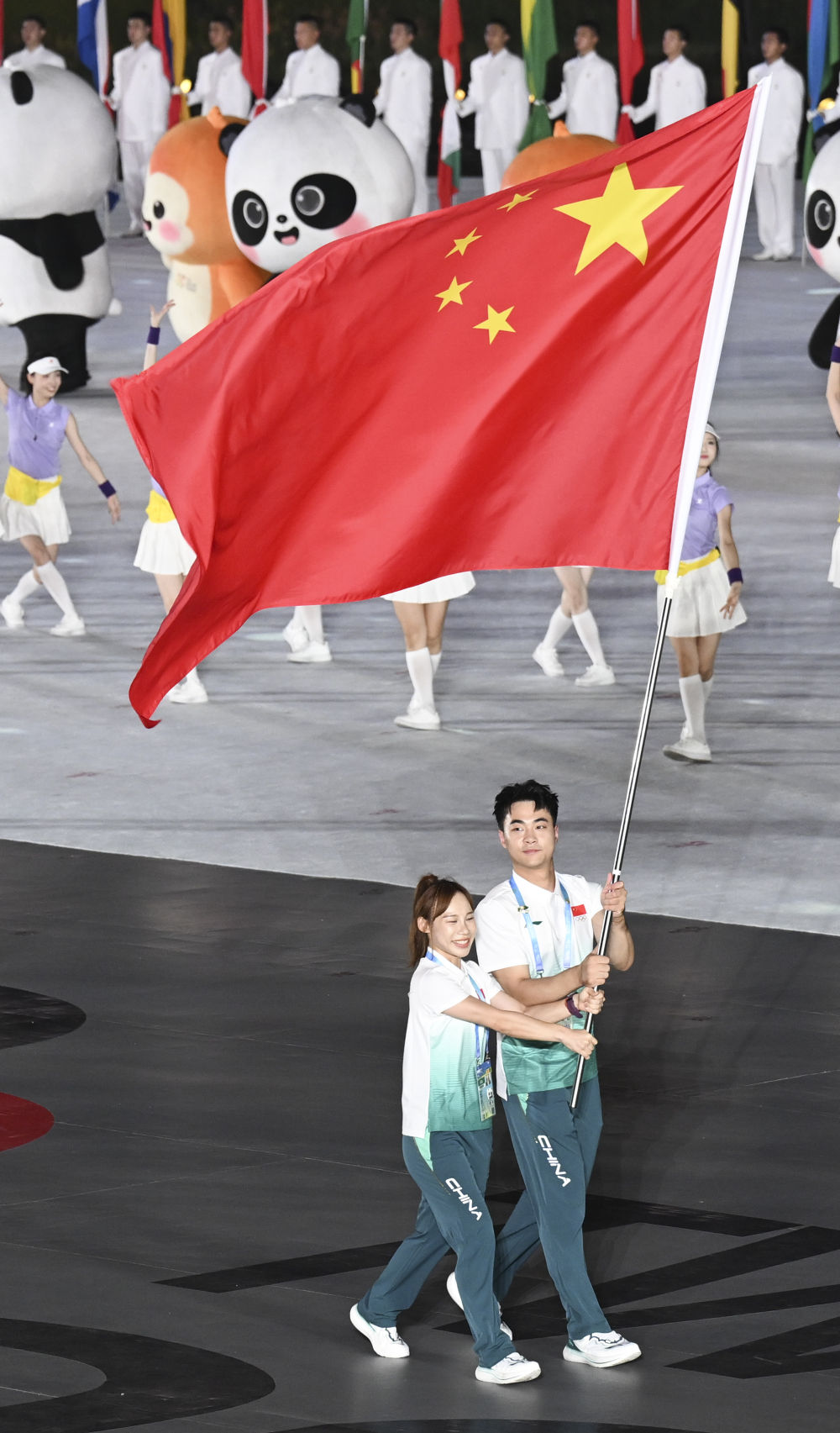 中国体育代表团旗手郭丹(左)和史经纬在开幕式上入场。新华社记者 杜子璇 摄