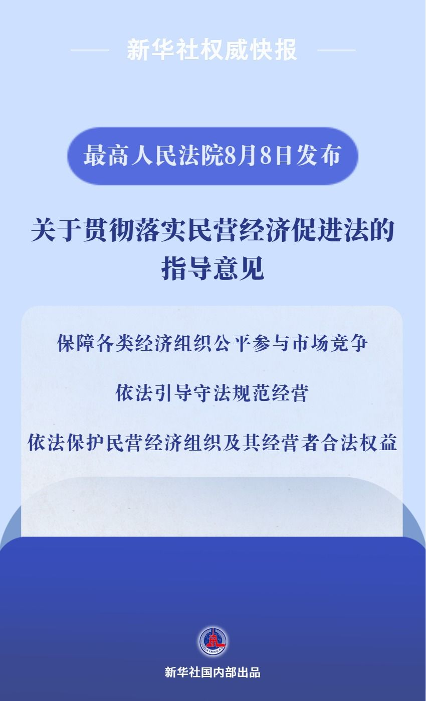 8月8日,最高人民法院发布关于贯彻落实《中华人民共和国民营经济促进法》的指导意见,进一步细化裁判规则,健全完善工作机制,致力解决实际问题,确保法律正确实施、统一适用。