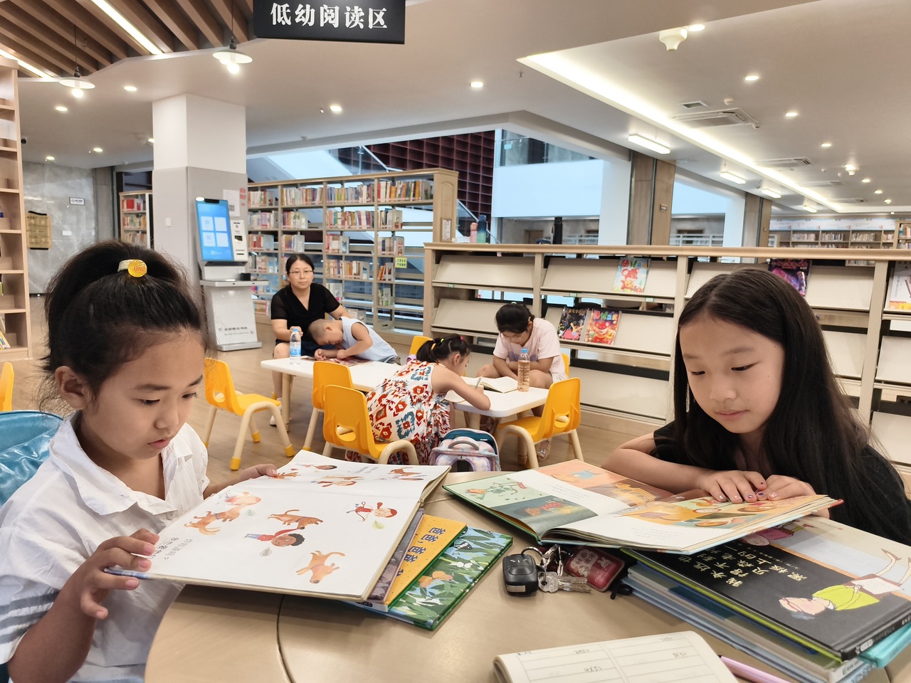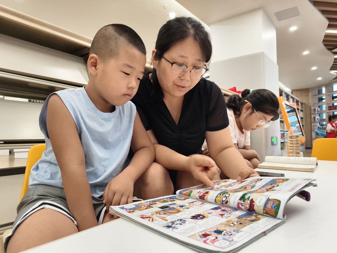 8月8日,在河北省石家庄新乐市图书馆,小学生和家长在阅读自己喜欢的儿童书籍。暑假期间,包括小学生在内不少学生在家长陪伴下来到图书馆、书店,看书纳凉闻书香,读书开阔视野,增加知识。(工人日报客户端记者 赵昂 通讯员 王瑞夫)