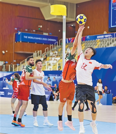 中国队球员与葡萄牙队球员在荷球混合团体比赛中。人民日报记者 蒋雨师 摄