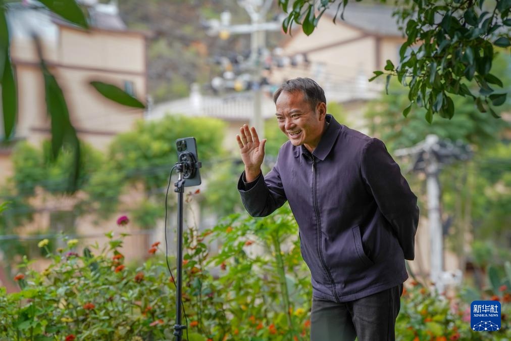 8月7日,庄子田居民小组党支部书记鲁春红用手机直播推介本村的仙人掌。新华社记者 彭奕凯 摄