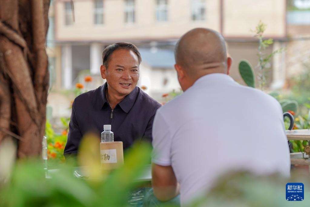 8月7日,庄子田居民小组党支部书记鲁春红(左)和村民商讨仙人掌种植规划。新华社记者 彭奕凯 摄