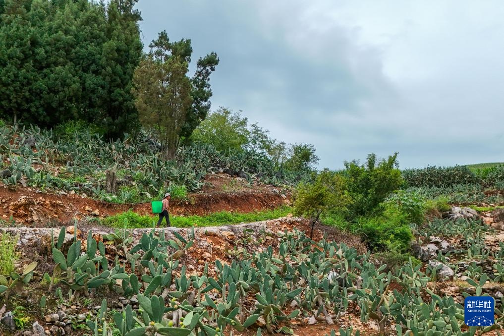 烈日下的云南省文山市新平街道红旗社区庄子田居民小组,数千亩仙人掌从石缝中倔强钻出,连缀成片,绿意盎然。