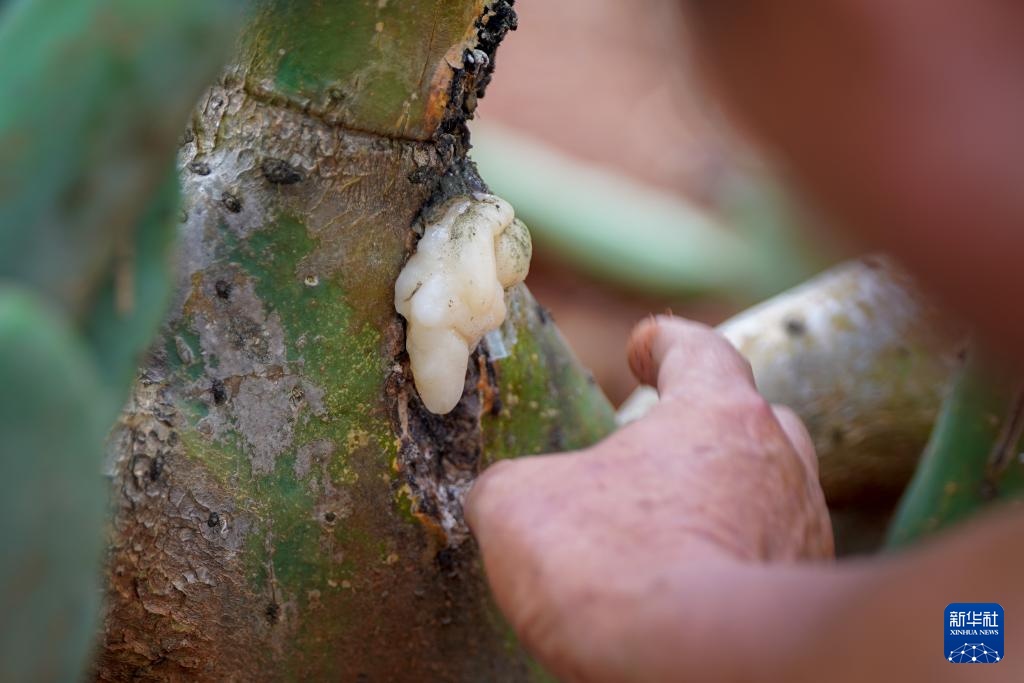 8月7日,庄子田居民小组村民在仙人掌种植基地收获仙人掌胶。新华社记者 彭奕凯 摄