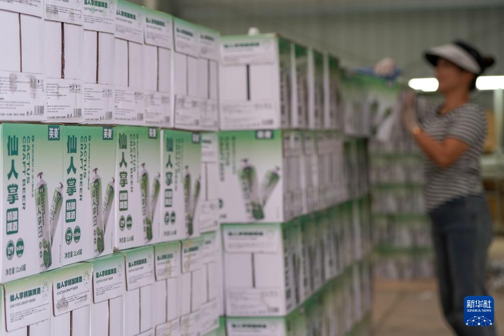 8月6日,庄子田村民在村里的仙人掌加工厂整理已装箱的仙人掌啤酒。新华社记者 彭奕凯 摄