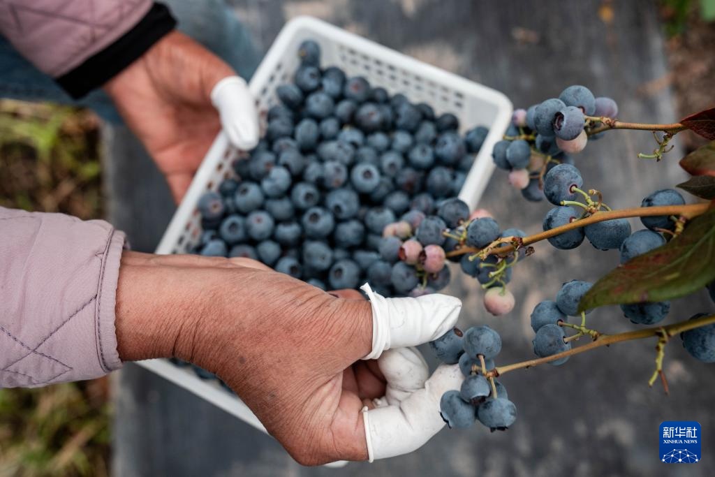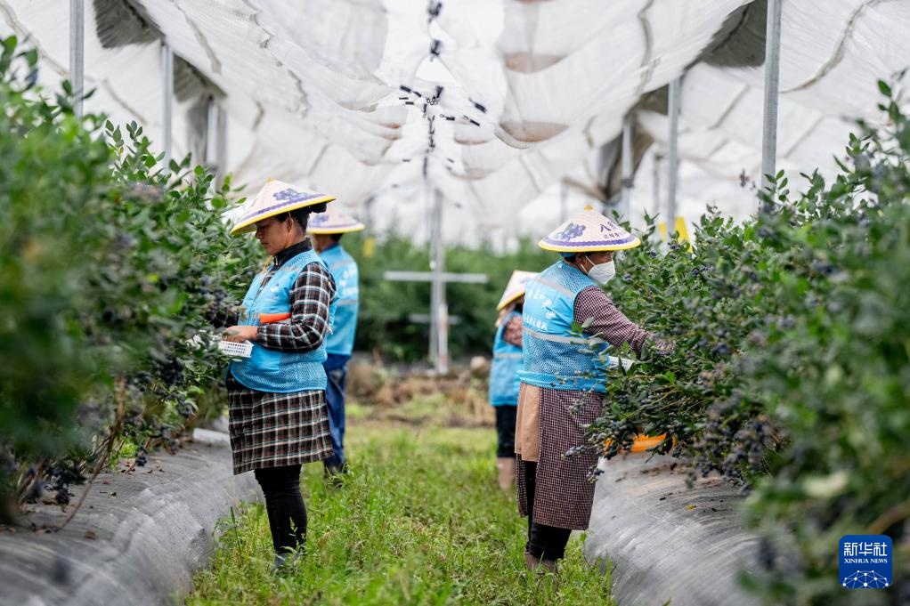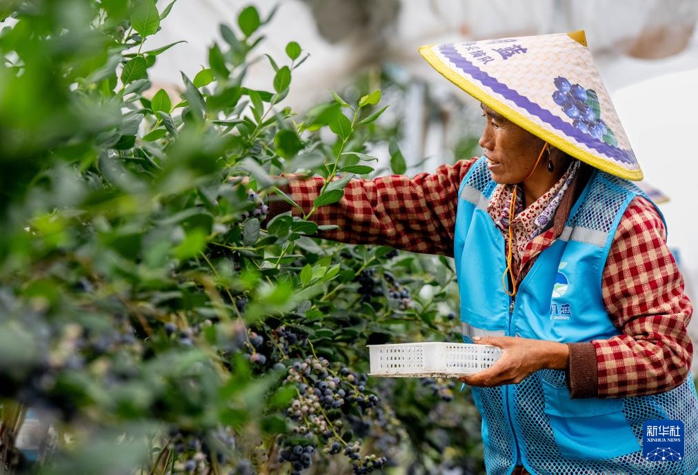 8月8日,工人在兰坪县高原特色现代农业产业园采摘蓝莓。新华社记者 胡超 摄