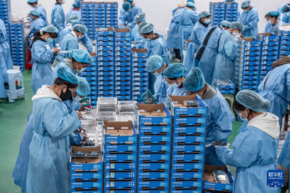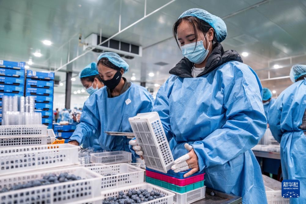 8月8日,工人在兰坪县高原特色现代农业产业园分拣、包装蓝莓鲜果。新华社记者 胡超 摄