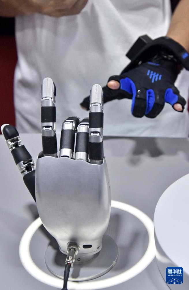8月8日,观众在2025世界机器人大会展馆内与机械手互动。新华社记者 李欣 摄