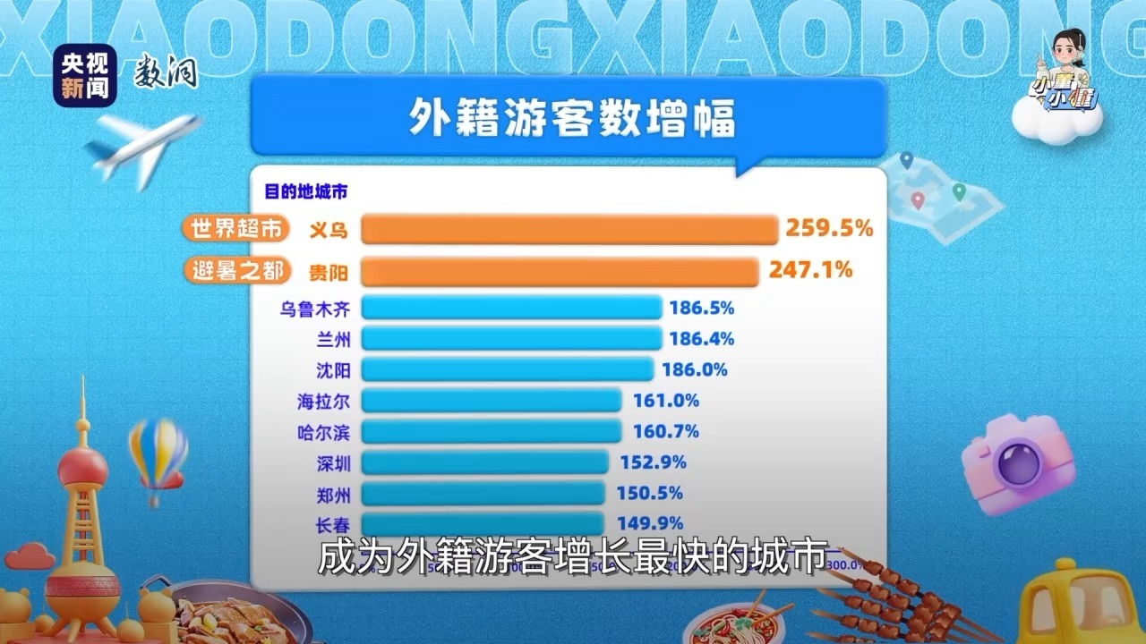 我们调取旅游平台数据发现,今年暑期,“世界超市”义乌、“避暑之都”贵阳成为外籍游客增长最快的城市,增幅都超过两倍。而且他们爱“串着玩”——广州深圳、上海杭州、成都重庆、深圳香港、北京天津等1小时都市圈的多城联动的火车线路最受欢迎。
