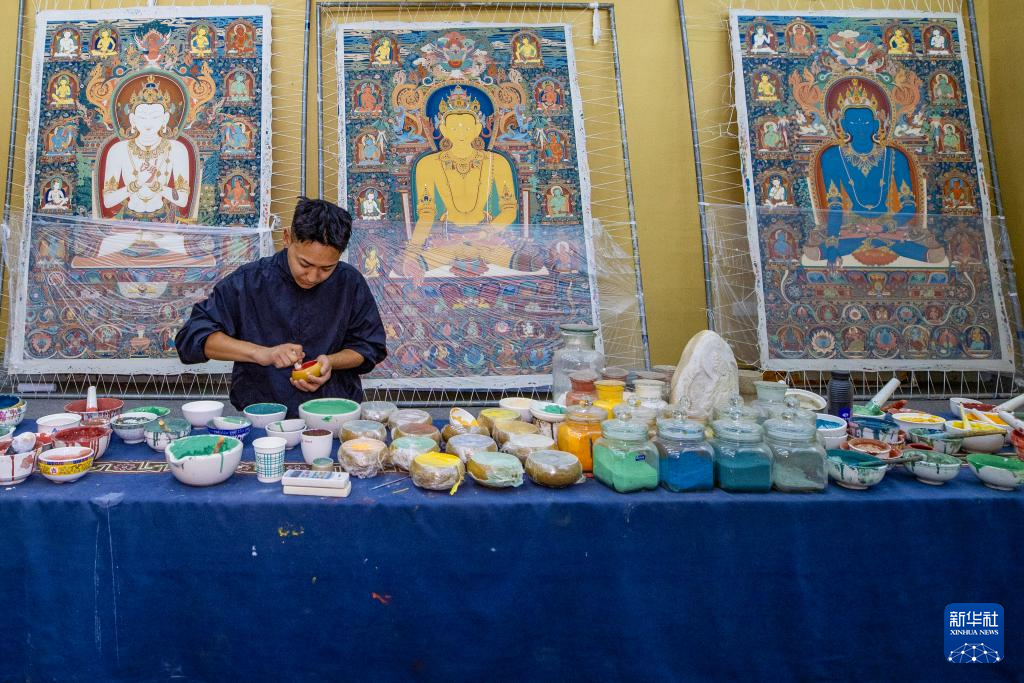 8月6日,一名画师在绘制唐卡。藏族唐卡(齐吾岗派)入选国家级非物质文化遗产代表性项目名录。新华社记者 旦增尼玛曲珠 摄