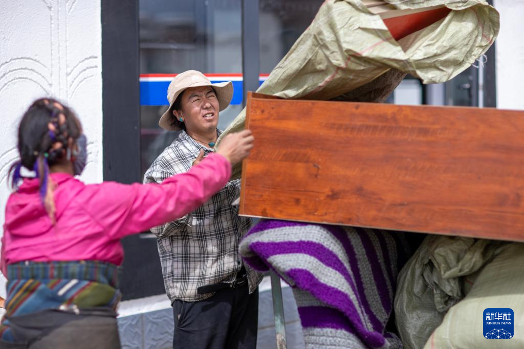 8月14日,西藏定日县森嘎村一户村民向新家搬运家具。新华社记者 姜帆 摄